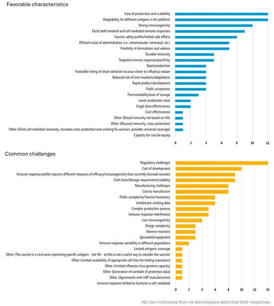 Favorable characteristics of and challenges with using next-generation influenza vaccine platforms. Developers were asked to select the top favorable characteristics and common challenges (maximum five each) associated with using their vaccine platform(s) for next-generation influenza vaccine development. The number of selected responses is shown for each option. If “Other” was selected, the open-ended response provided by the developer is included. Abbreviations: HA, hemagglutinin; flu, influenza; LNP, lipid nanoparticle.