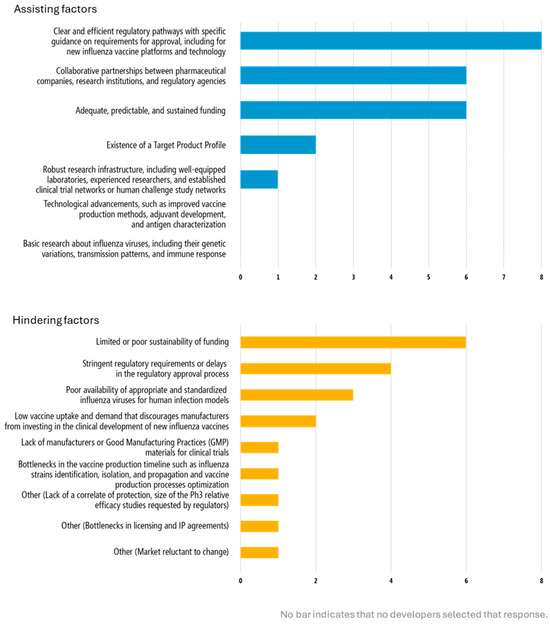 High costs of clinical trials and the funding required to support development of next-generation influenza vaccines were identified as significant challenges for developers. Cost of development was the second-most cited challenge with using next-generation influenza vaccine platforms (Figure 2). Developers selected funding, whether “adequate, predictable, and sustained” (two-thirds of responses) as assisting clinical development while limited and poorly sustained funding was a barrier (Figure 3). Funding for and cost of preclinical development is also a key issue.