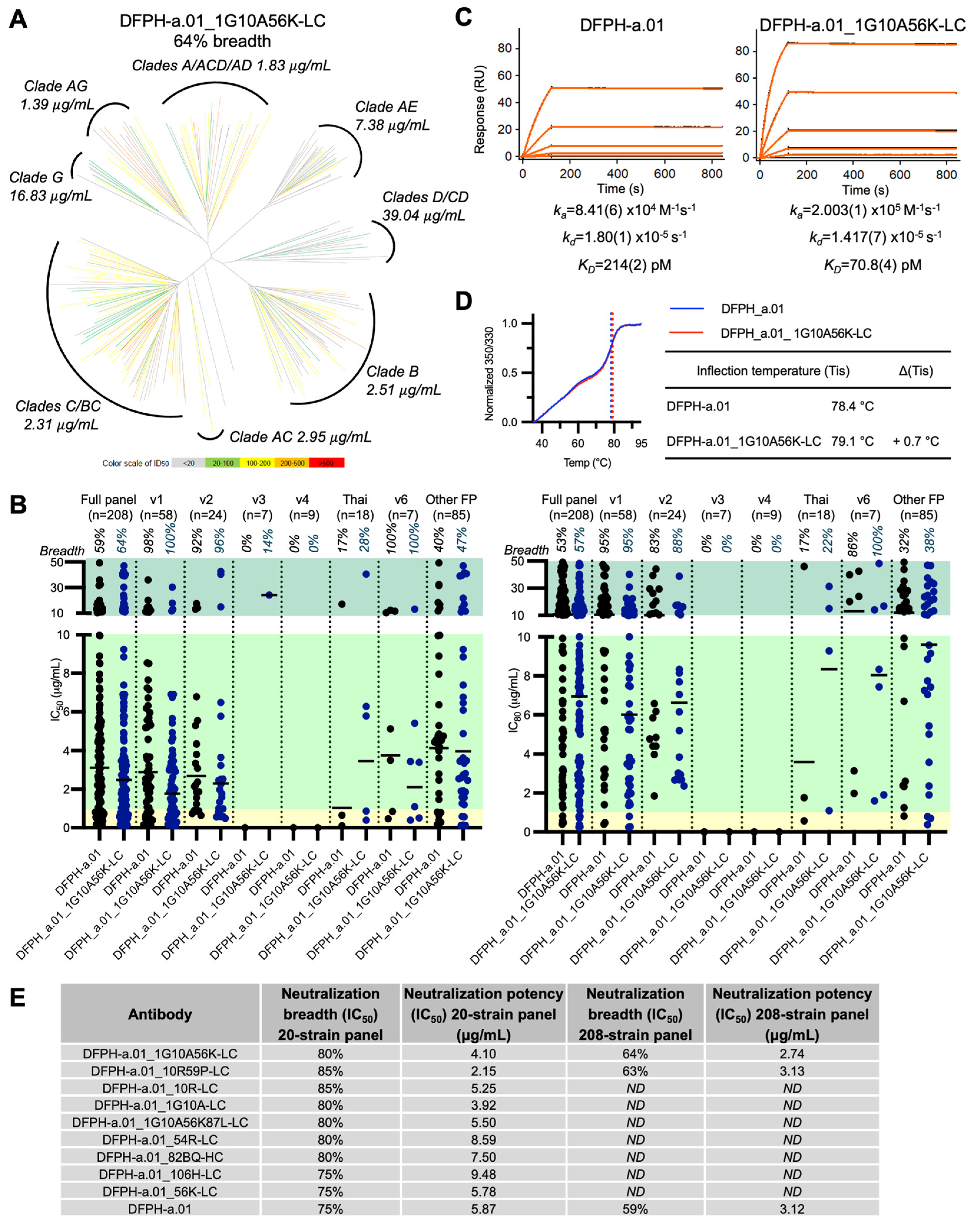 3.7. A Second Yeast Display-Identified Antibody, DFPH-a.01_1G10A56K-LC, with 64% Neutralization Breadth