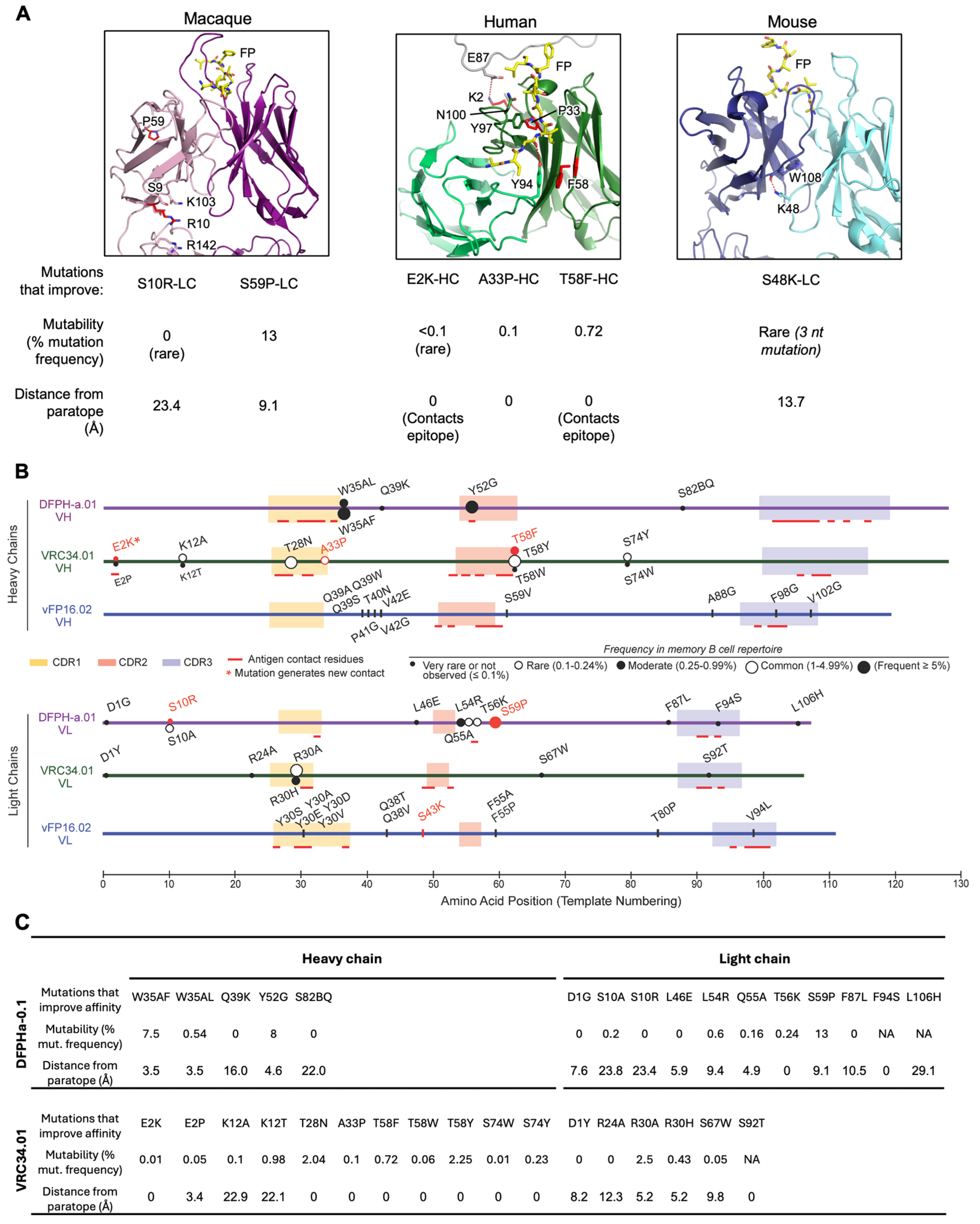 3.8. Comparative Analysis of Improving FP Broadly Neutralizing Antibody Mutations Across Macaque, Mouse, and Human Studies
