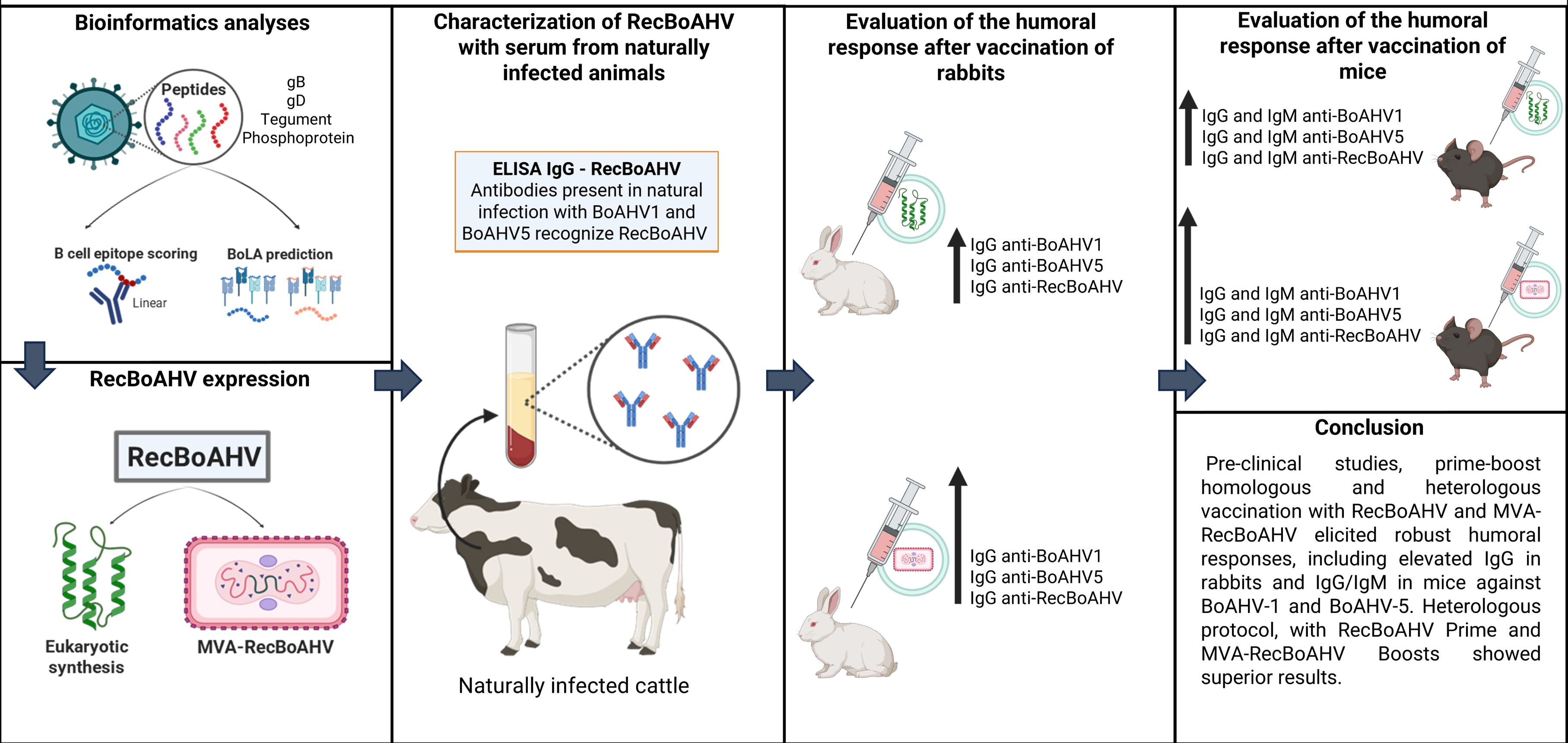 We have designed a recombinant multi-epitope, chimeric protein, consisting of four immunodominant, linear, and conserved epitopes from proteins of BoAHV-1 and BoAHV-5. Based on in silico analysis and data from the literature, we were able to define the most immunogenic epitopes among structural and non-structural viral proteins of the two viruses. The selected proteins were the glycoproteins gB and gD due to their key roles in infection, strong immunogenicity, and potential for vaccine development as well as the non-structural tegument phosphoprotein (UL47), which effectively induces cellular immune responses and elicits some humoral response. The genes encoding these epitopes were assembled in tandem in a single open reading frame, flanked by flexible linkers, and expressed in Escherichia coli as well as in a poxviral platform using a recombinant modified virus vaccinia Ankara, both capable of inducing humoral and cellular response (patent PI 1101186-6). The antigenicity of the purified protein was first evaluated in Western blot and indirect ELISA assays using the sera of naturally infected bovines. The immunogens were assessed in rabbit and mouse immunization models, where they elicited robust immune responses, underscoring the efficacy of the constructs.