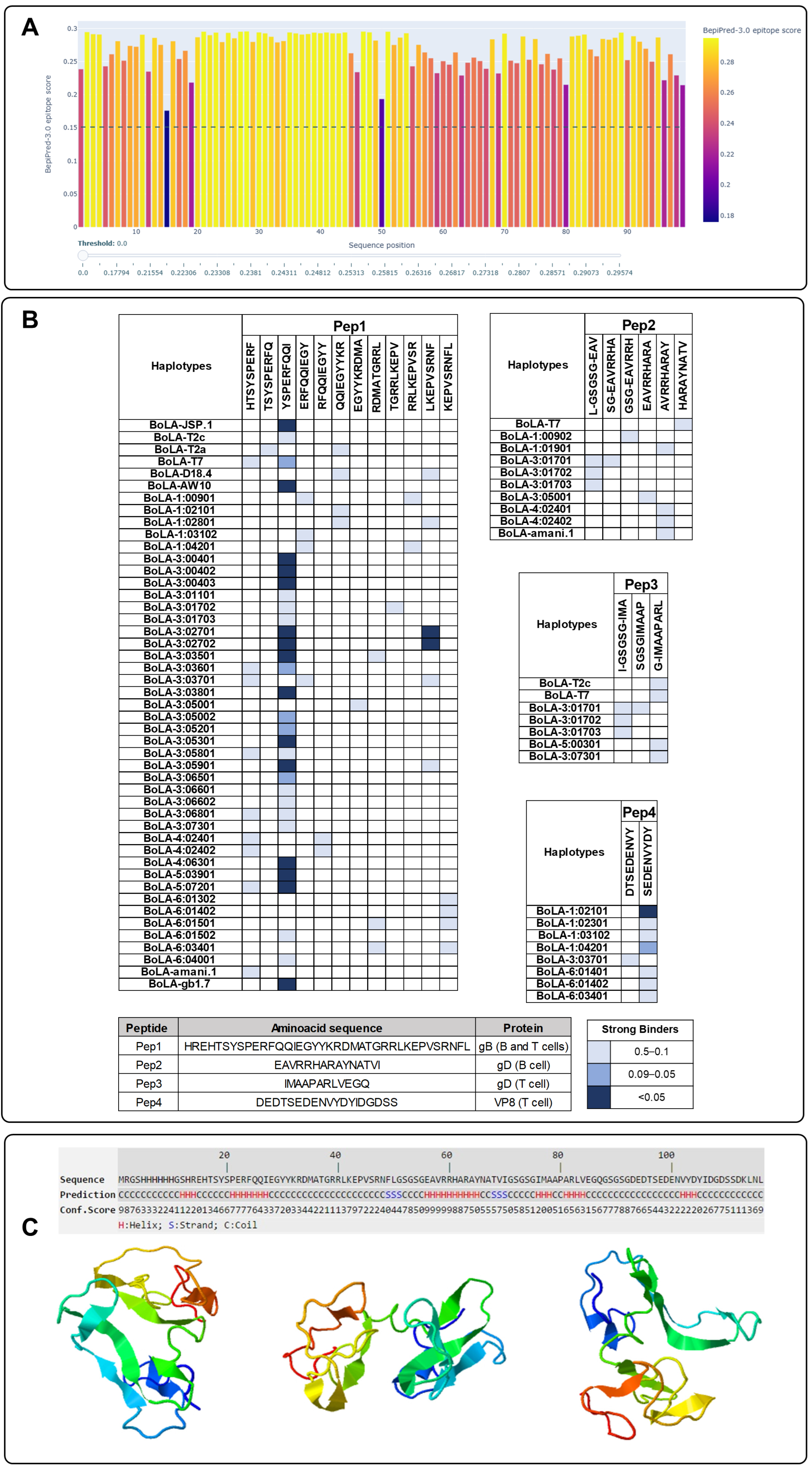 Figure 1. In silico evaluation of the RecBoAHV multi-epitope construct. (A) Prediction of linear B-cell epitopes using the BepiPred 3.0 tool. The full amino acid sequence of the RecBoAHV construct was analyzed, with residues scoring above the default threshold of 0.15 considered as potential antigenic sites. Regions exceeding the threshold are shown, with a prominent peak corresponding to residues 20–45 (within Pep1), which displayed the highest B-cell epitope scores. (B) Prediction of T-cell epitopes based on binding affinity to bovine leukocyte antigen (BoLA) class I haplotypes, using the NetMHCpan 4.1 tool. A total of 32 peptides was analyzed across 62 BoLA haplotypes (15 in Pep1, 8 in Pep2, 6 in Pep3, and 3 in Pep4). Strong binders (SB) were defined as peptides with predicted affinity ≤ 0.5 and are indicated in the heatmap. (C) Predicted three-dimensional structure of the RecBoAHV protein, generated by I-TASSER (I-TASSER server for protein structure and function prediction). The model is shown in three orientations, with α-helices, β-strands, and loop regions annotated. Selected epitopes are mapped on the protein surface to illustrate their accessibility and structural context.