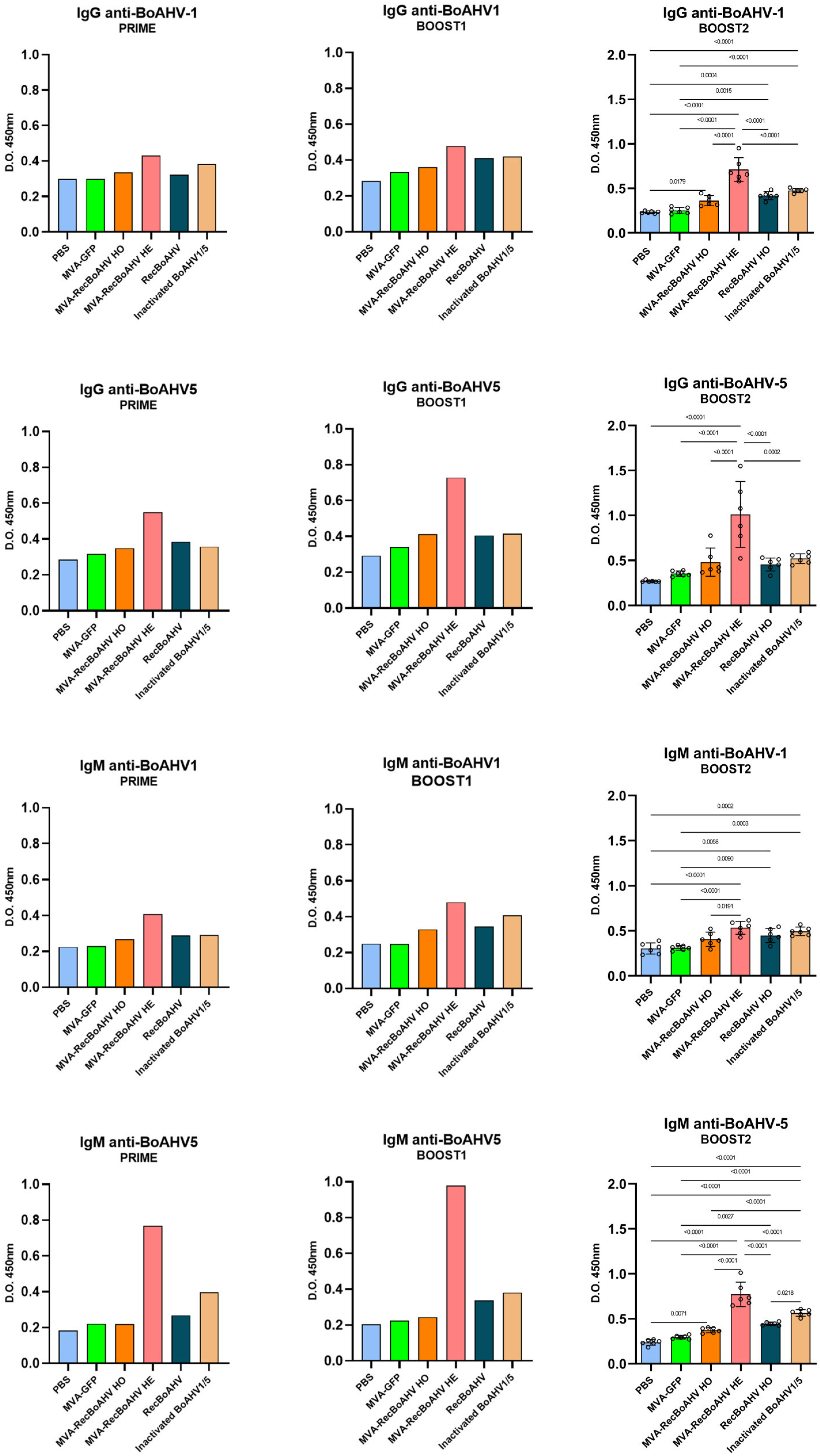 Figure 5. Evaluation of the antibody responses in C57BL/6 mice after vaccination. Indirect ELISA anti-bovine IgG and IgM for BoAHV1 and BoAHV5 antigens from mice immunized with MVA-RecBoAHV. The animals were immunized in a prime-boost-boost protocol. All groups consisted of six animals per group. Prime and Boost 1 were evaluated in a pool format, being tested in two technical replicates. Boost 2 was evaluated individually in single replicates. The statistics presented for the boost 2 results correspond as follows: IgG BoAHV1 was performed using ANOVA multiple comparisons test with post hoc Tukey’s, IgG BoAHV5 was performed using Kruskal–Wallis multiple comparisons test with post hoc Dunn’s, and IgM BoAHV5 was performed using ANOVA multiple comparisons test with the post hoc Tukey’s test.