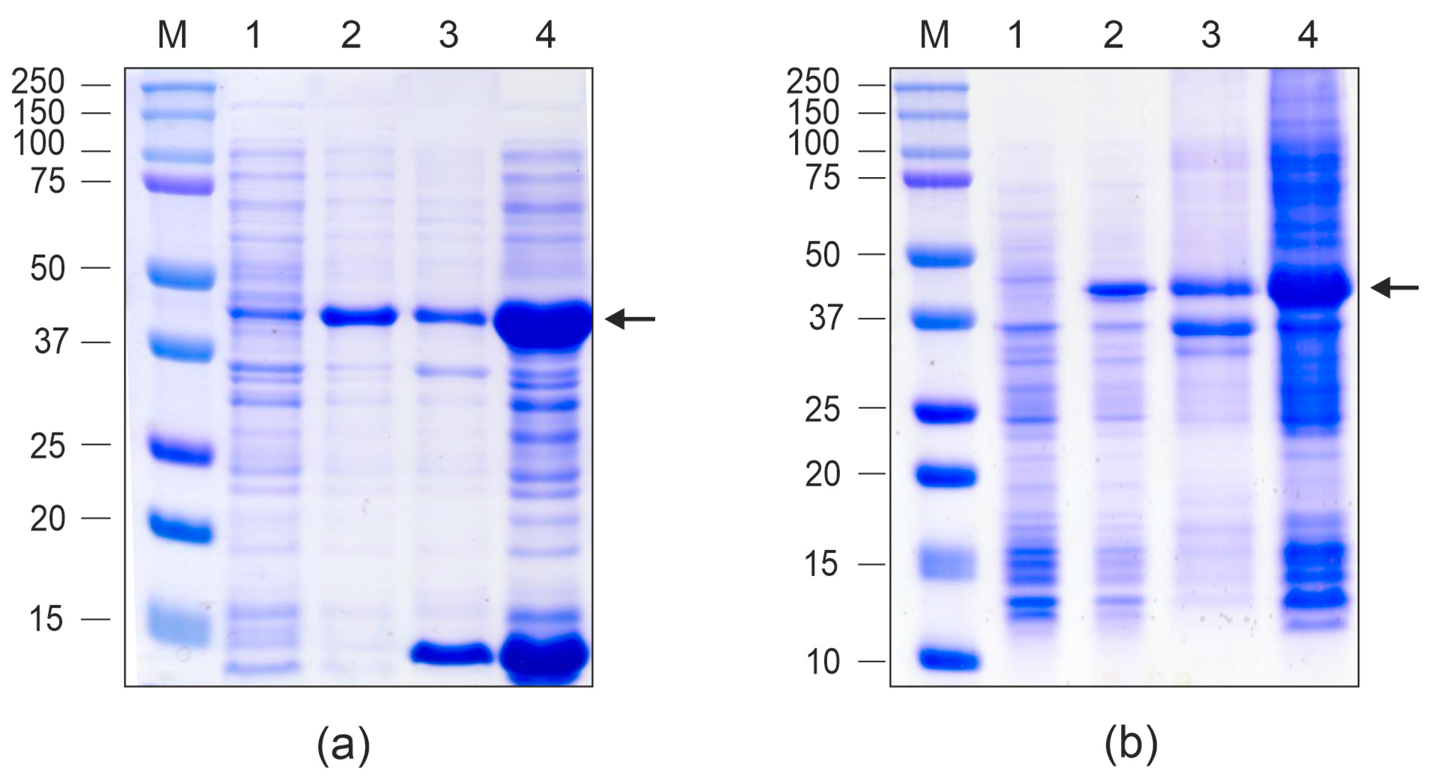 - Dümmler, A.; Lawrence, A.-M.; de Marco, A. Simplified Screening for the Detection of Soluble Fusion Constructs Expressed in E. Coli Using a Modular Set of Vectors. Microb. Cell Fact. 2005, 4, 34. [Google Scholar] [CrossRef]