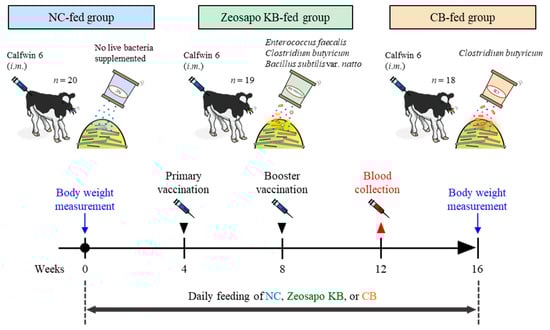 Outline of a clinical study of vaccination during feeding of NC, Zeosapo KB, or CB. This clinical study was divided into three feeding groups: (1) twenty calves fed with negative control feed (NC); (2) nineteen calves fed with live bacteria-mixed feed (Zeosapo KB); and (3) eighteen calves fed with C. butyricum-only feed (CB). All calves were administered with “KYOTOBIKEN” Calfwin 6 Combo Live Vaccine intramuscularly at 4 and 8 weeks after the start of the feeding. Peripheral blood samples were collected from all calves 4 weeks after the booster vaccination. The calves were weighed at the start and end of the study. i.m.–intramuscular injection. The date for each treatment is shown in Supplemental Table S2.