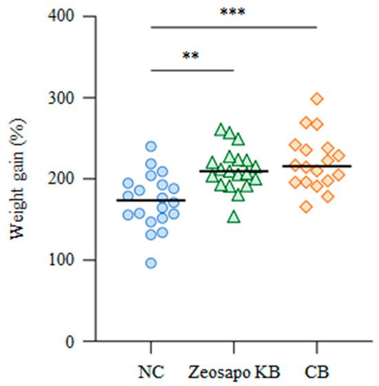 To examine the effects of Zeosapo KB and CB on the growth rate of calves, all calves were weighed individually at the start and end of the feeding. The median weight gains of the NC-, Zeosapo KB-, and CB-fed groups were 173.7, 209.6, and 215.7%, respectively (Figure 2). These results suggest that a more significant weight gain was observed in the Zeosapo KB- and CB-fed groups than the NC-fed group.