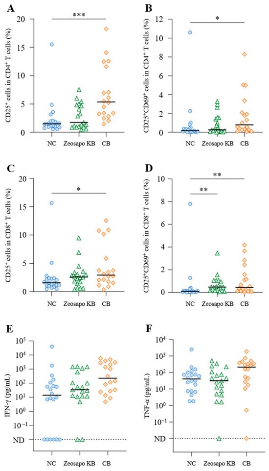 Effects of Zeosapo KB or CB feeding on T-cell subsets in PBMCs. (A–F) PBMCs isolated from calves (NC, circle, n = 20; Zeosapo KB, triangle, n = 19; CB, diamond, n = 18) 4 weeks after the booster vaccination were cultured only with medium for 5 days. The proportions (%) of CD25+ and CD25+CD69+ cells in CD3+CD4+ T cells (A,B) and CD3+CD8+ T cells (C,D) were analyzed by flow cytometry. IFN-γ (C) and TNF-α (D) productions from PBMCs isolated from each animal were measured by ELISA in duplicate. Statistical significance was determined by the Dunn’s test after the Kruskal–Wallis test for multiple-group comparisons. * p < 0.05, ** p < 0.01, *** p < 0.001. ND, not detected. The data for IFN-γ and TNF-α included samples that were below the detection limit and the statistical analysis was not performed on these data.
