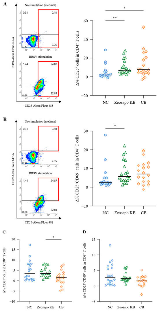 The Δ% CD25+ cells were significantly higher in CD3+CD4+ T cells stimulated with BRSV antigen in the Zeosapo KB- and CB-fed groups than in those in the NC-fed group (Figure 4A). Furthermore, the Δ% CD25+CD69+ cells significantly increased in CD3+CD4+ T cells stimulated with BRSV antigen, especially in the Zeosapo KB group (Figure 4B). However, CD8+ T-cell activation was not strongly induced, even after the booster vaccination (Figure 4C,D). Thus, the proportion of activated CD4+ T cells in response to BRSV antigen increased in the Zeosapo KB- and CB-fed groups.