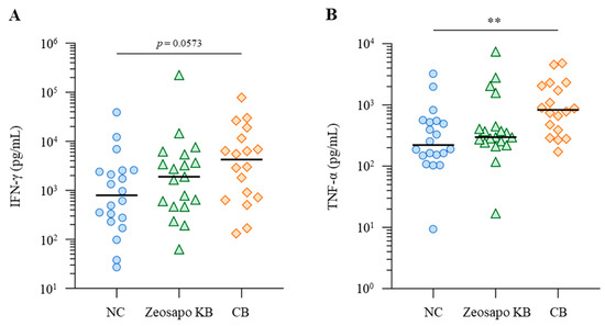 To determine the effects of Zeosapo KB and CB feeding on whole T-cell subsets, we compared T-cell activation without stimulation among the three groups. Four weeks after the booster vaccination, CD25 and CD69 expression was analyzed as activation-induced markers (AIM) [13] in CD3+CD4+ and CD3+CD8+ T cells from PBMCs cultured without stimulation by flow cytometry (Figures S1–S3). The percentages of CD25+ and CD25+CD69+ cells in both CD3+CD4+ and CD3+CD8+ T cells were significantly increased in PBMCs under CB feeding (Figure 3A–D). Furthermore, the percentage of CD25+CD69+ cells in CD3+CD8+ T cells significantly increased in the Zeosapo KB-fed group (Figure 3D). Furthermore, we also measured IFN-γ and TNF-α levels in supernatants of PBMCs cultured without stimulation four weeks after the booster vaccination by ELISA. IFN-γ production was significantly higher in the CB-fed group (median: 225.1 pg/mL) than in the NC-fed group (median: 13.8 pg/mL; Figure 3E). TNF-α production also tended to increase in the CB-fed group (Figure 3F). The median TNF-α concentration was 40.8 and 211.5 pg/mL in PBMCs cultured without stimulation in the NC- and CB-fed groups, respectively (Figure 3F). These results indicate that the oral feeding of CB could activate T cells and induced Th1 cytokine production in circulating PBMCs.