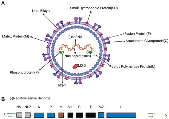 RSV is classified under the order Mononegavirales, the family Pneumoviridae, and the genus Orthopneumovirus. This virus is a non-segmented negative-strand RNA virus. The genome of RSV has an approximate length of 15.2 kb and comprises 11 open reading frames, which encode 9 structural proteins (F, G, N, P, M, SH, L, M2-1, and M2-2) and 2 non-structural (NS) proteins (Figure 1) [6,7,8].