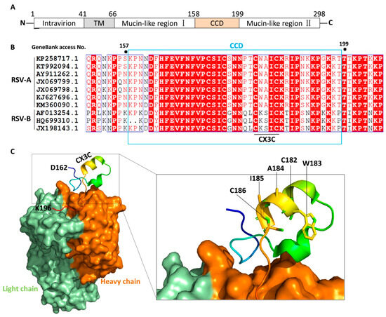 Schematic diagram of RSV G protein structure. (A). Schematic representation of the RSV G protein, with its N-terminus located intracellularly and C-terminus extracellularly, anchored to the viral envelope via the TM domain. CCD is located at amino acids 158–199, containing a CX3C motif (Cys182–Cys186). Mucin-like regions flanking the CCD are highly variable and glycosylated. (B). Sequence alignment of G protein CCD among the indicated strains of RSV. Protein sequences were retrieved from NCBI nucleotide database using the indicated GenBank access numbers. Fully conserved residues have a red background while predominant residues are colored red. (C). Schematic diagram of the binding mode between the CCD domain and the neutralizing antibody fragment, Fab CB017.5 (PDB code: 6BLH). The diagram was generated by PyMOL 2.5. The CCD is shown in cartoon representation with the heavy and light chains of antibody colored orange and green, respectively.