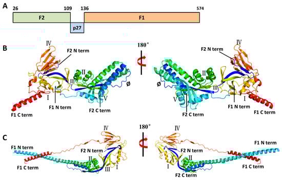 The F protein is derived from the F0 precursor protein. The F0 protein consists of 574 amino acids, has a polybasic sequence (KKRKRR136), and lacks biological activity [23]. Furin-like proteases can cleave at two polybasic cleavage sites (RARR109 and KKRKRR136) on the F0 precursor protein, generating two subunits, F1 and F2, and simultaneously releasing an internal 27-amino-acid peptide segment called p27 (residues 110–136) (Figure 3A) [24,25]. F protein, which mediates the fusion of the virus with the host cell membrane, has two main conformational states: PreF and PostF. The F1 and F2 proteins can be covalently linked by disulfide bonds to form a heterodimer NH2-F2–F1–COOH (Figure 3B), and form a trimer in the endoplasmic reticulum, that is, the metastable PreF conformation [8]. Triggered by unknown factors or thermodynamic instability, the tertiary structure of the PreF protein undergoes extensive rearrangement (Figure 3C). The N-terminus of the protein extends and inserts the hydrophobic fusion peptide of the F1 subunit into the host cell membrane. Subsequently, PreF collapses, and the fusion peptide anchors into the target cell membrane, connecting the virus and the host membrane to form a rod-shaped and stable PostF [26].