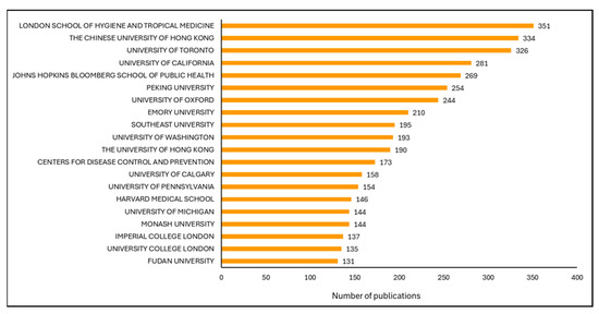 The top 20 most productive institutions contributed between 131 and 351 publications each (Figure 2). The London School of Hygiene and Tropical Medicine led with 351 publications, followed by the Chinese University of Hong Kong (334) and the University of Toronto (326). The top five most prolific institutions also include the University of California (281) and Johns Hopkins Bloomberg School of Public Health (269).
