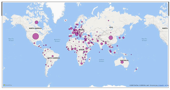 Figure 3. Geographical distribution of publications on vaccination social science *. * The size of the cycle represents the number of publications.