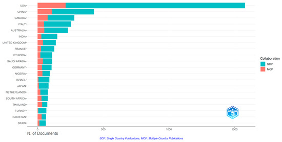 Research activity spans across 146 countries globally (Figure 3), with disparities in research productivity. The top 20 publishing countries represent five UN regional groups according to the United Nations Statistics Division (UNSD) geographic classification [20], which provides a standardized framework for comparing countries and regions globally: Northern America (USA, Canada), Europe (Italy, UK, France, Germany, Netherlands, Spain), Asia (China, India, Japan, Thailand, Pakistan, Saudi Arabia, Turkey, Israel), Africa (Ethiopia, Nigeria, South Africa), Western European and other states (USA, Canada, Israel) and Oceania (Australia). The top 5 highest countries were the USA, China, Canada, Italy, and Australia. Three African countries feature among the top 20, namely, Ethiopia (9th), Nigeria (12th), and South Africa (16th). Most of these countries demonstrated a greater number of substantial single-country publications (SCPs) compared to multiple-country publications (MCPs) (Figure 4).