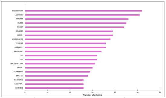 The top 20 most prolific authors are shown in Figure 5. Wiwanitkit V, Larson HJ, Omer SB, Dubé E, Wang Y, Wang J were notable authors from this list leading vaccination social science research.
