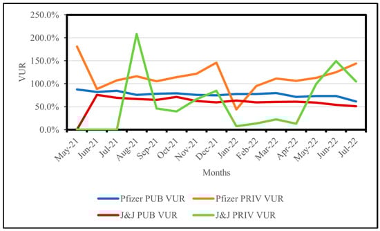 For PRIVs, Table 1 and Figure 1 illustrate that in August 2021, J&J PRIVS (n = 5) documented the highest VUR of 208%, while in November 2021, a VUR of 66.2% (n = 16) was recorded with the maximum number of administered doses. January 2022 documented the maximum number of issued doses with a VUR of 7.4% (n = 14).