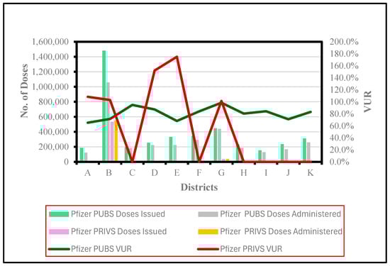 Pfizer VUR was calculated in 100% of (n = 11) PUBS districts for the study period (Figure 2). Figure 2 shows that Pfizer PUBS District B recorded a VUR of 71.4% (n = 21–23), with the maximum number of doses issued and administered. Conversely, Pfizer PUBS District G exhibited the highest VUR of 98.4% (n = 7–9). Pfizer PUBS District K reported the highest number of VUR facilities (n = 33–62) with a VUR rate of 83.1%.