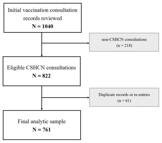 A total of 1040 vaccination consultation records were reviewed. After excluding 218 consultations not meeting the CSHCN definition and 61 duplicate records, the final analytic sample included 761 eligible participants as shown in Figure 1.