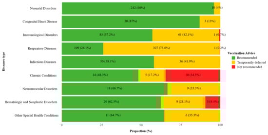 Across all vaccine recommendations among CSHCN, 55.2% (567/1028) were recommended for vaccination, 43.4% (446/1028) were temporarily deferred, and 1.5% (15/1028) were not recommended. The distribution of vaccination advice differed significantly across disease categories (χ2 = 577.5, p < 0.001). In the respiratory disease group, 307 out of 417 doses (73.6%) were temporarily deferred. Among children with immunological disorders, 42.1% of doses (61/145) were deferred, and 0.7% (1/145) were not recommended. Notably, children with chronic conditions showed the highest proportion of non-recommendation, with 10 out of 29 doses (34.5%) classified as not recommended. Children with neonatal disorders and congenital heart disease had the lowest proportion of deferred or non-recommended doses—10/252 (4.0%) and 3/23 (13.0%) doses, respectively, were deferred or not recommended (Figure 2).
