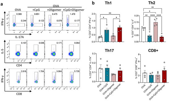 CpG and/or Oligomer scaffold. Splenocytes were harvested 12 days after the booster dose and analyzed by intracellular cytokine staining after ex vivo re-stimulation with OVA. (a) Representative bivariate density plots showing cytokine-producing CD4+ and CD8+ T cells; numbers indicate the percentage of lymphocytes within the indicated rectangular gating regions. (b) Percentages of lymphocytes for Th1, Th2, Th17 T-cell subsets, and activated CD8+ T cells. Bars represent mean ± SEM (n = 4 per group); individual mice are shown as circles. * p < 0.05; ** p < 0.01; **** p < 0.0001.