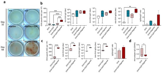 To evaluate the effect of Oligomer scaffold delivery on antigen-specific antibody production, we measured OVA-specific IgG isotypes and quantified ASCs in bone marrow at early (Day 32) and late (Day 68) time points (Figure 4). Twelve days after the booster, total OVA-specific IgG titers were similar among groups. However, mice immunized with OVA + CpG + Oligomer exhibited significantly higher IgG2a levels than all other groups (Figure 4b), consistent with their Th1-skewed T-cell response (Figure 3) as IgG2a is associated with IFN-γ secretion and Th1 differentiation [,]. This group also had a greater number of OVA-specific IgG-secreting ASCs in the bone marrow compared with all other groups (Figure 4a,b). To further assess response durability, antibody levels and ASCs were measured 48 days after the booster (Day 68). At this later time point, OVA + CpG + Oligomer immunization maintained significantly higher IgG, IgG1, and IgG2a titers than the OVA + CpG group, along with marked increase in bone marrow ASCs, indicating enhanced persistence of the humoral response (Figure 4c).