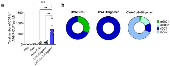 Co-delivery of CpG and OVA within the Oligomer scaffold enhances DC uptake and transport of vaccine antigen to draining lymph nodes. (a) Total number of AF647-OVA+ CD11c+ DCs in the draining lymph node. (b) Proportional distribution of OVA-containing migratory mDC1 (CD103+ CD11b− CD205+ CD207+), mDC2 (CD103− CD11b+ CD205+), lymph node–resident rDC1 (CD8+ CD11b− CD205+) and rDC2 (CD8− CD11b+ CD205+) subsets. Data are mean ± SEM (n = 4 per group except n = 2 for PBS) and are representative of two independent experiments. Statistical significance was determined by one-way ANOVA with Tukey’s post hoc test. ** p < 0.01, *** p < 0.001.
