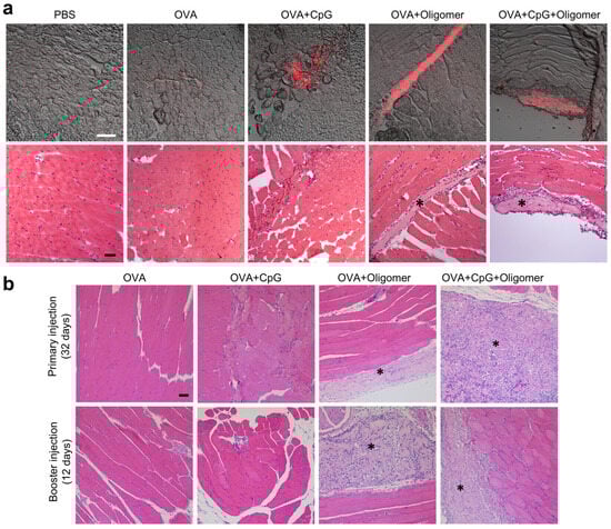 Antigen retention and local tissue responses at injection sites with Oligomer scaffold vaccination. (a) Representative confocal images of fluorescently labeled OVA (top; red fluorescence) and corresponding H&E-stained sections (bottom) of hindlimb muscles 2 days after primary injection. Images show group-dependent antigen retention and early cellular infiltration. (b) H&E-stained sections at 32 days after the primary injection (top) and 12 days after the booster injection (bottom), highlighting differential cell infiltration patterns. The Oligomer scaffold appears as light eosinophilic material (*). Scale bars: a = 100 µm; b = 50 µm.
