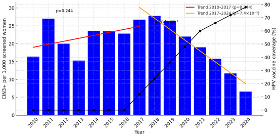 We also note a 24% reduction in the number of screening tests from 2017 to 2024. This should not be interpreted as a deterioration of the programme but as a contextual factor. Part of the higher screening activity earlier in the period likely reflected temporary, media-driven demand for extra cytology in young women, while from 2023 the programme shifted to primary HPV testing, which may have normalized attendance [24]. Because our outcome is histology-defined CIN3+ expressed per 1000 screened unique women, the observed decline is unlikely to be explained by lower screening volume alone and is more plausibly driven by the increasing proportion of vaccinated cohorts entering screening.