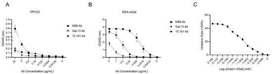 Figure 1. PPV23 can bind to anti-Gal antibodies and be competitively inhibited by Galα1-3Gal. (A) ELISA showing binding of PPV23 to the anti-Gal monoclonal antibodies M86, 15.101, and Gal-13 mAb. (B) ELISA analysis of BSA-αGal binding to the anti-Gal monoclonal antibodies M86, 15.101, and Gal-13 mAb. (C) Competitive ELISA demonstrating dose-dependent inhibition of M86 mAb binding to PPV23 by Galα1-3Gal disaccharide. Data are representative of three independent experiments, and values are shown as mean ± SEM.