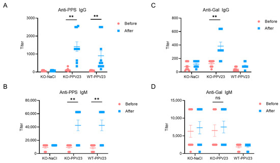 Figure 3. Anti-PPS and anti-Gal antibody responses in WT and α3GalT1 KO mice following PPV23 immunization. Serum levels of (A) PPS-specific IgG, (B) PPS-specific IgM, (C) αGal-specific IgG, and (D) αGal-specific IgM were measured by ELISA. Data were pooled from two independent experiments (n = 10 mice per group). Values are presented as mean ± SEM. Each symbol represents an individual mouse. Statistical significance was determined using the Wilcoxon signed-rank test; ** p < 0.01, ns (not significant).