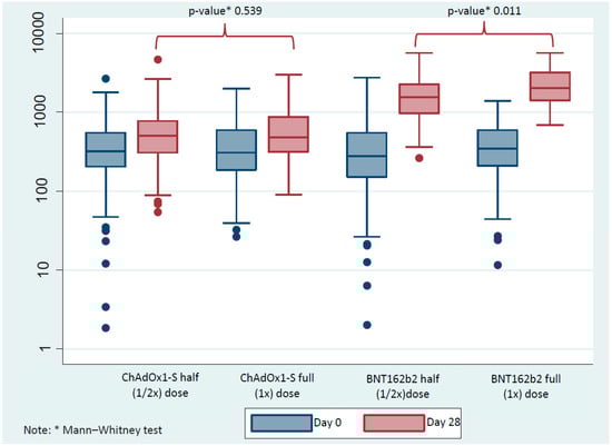 The difference in immunoglobulin G (IgG) anti-spike protein receptor-binding domain (anti-S-RBD) (BAU/mL) as evaluated at day 0 and day 28 between half (1/2×) and full (1×) doses of the ChAdOx1-S and BNT162b2. A Mann–Whitney test was used to compare between half and full doses at each time point. Solid blue and red circles indicate outliers.