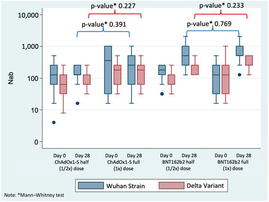 We also analyzed the sVNT at the day 0 and day 28 time points using the Delta variant and Wuhan strain antigens. The results revealed no statistically significant difference between the half-dose and full-dose groups at these time points, both for the Delta variant and the Wuhan strain antigens of the BNT162b2 and ChAdOx1-S vaccines. This finding was similar to study results from Thailand and the UK, which revealed strong antibodies against Omicron and four other variants, including Delta, after a third dose of an mRNA vaccine [,]. Meanwhile, a ChAdOx1-S heterologous boost was more immunogenic in CoronaVac-prime recipients than in ChAdOx1-S-prime recipients []. Along with the sVNT, we analyzed NAbs at the day 0 and day 28 time points for both the Wuhan strain and the Delta variant antigen. The results also revealed no statistically significant difference between the half-dose and full-dose groups at these time points for either antigen with the ChAdOx1-S and BNT162b2 vaccines.