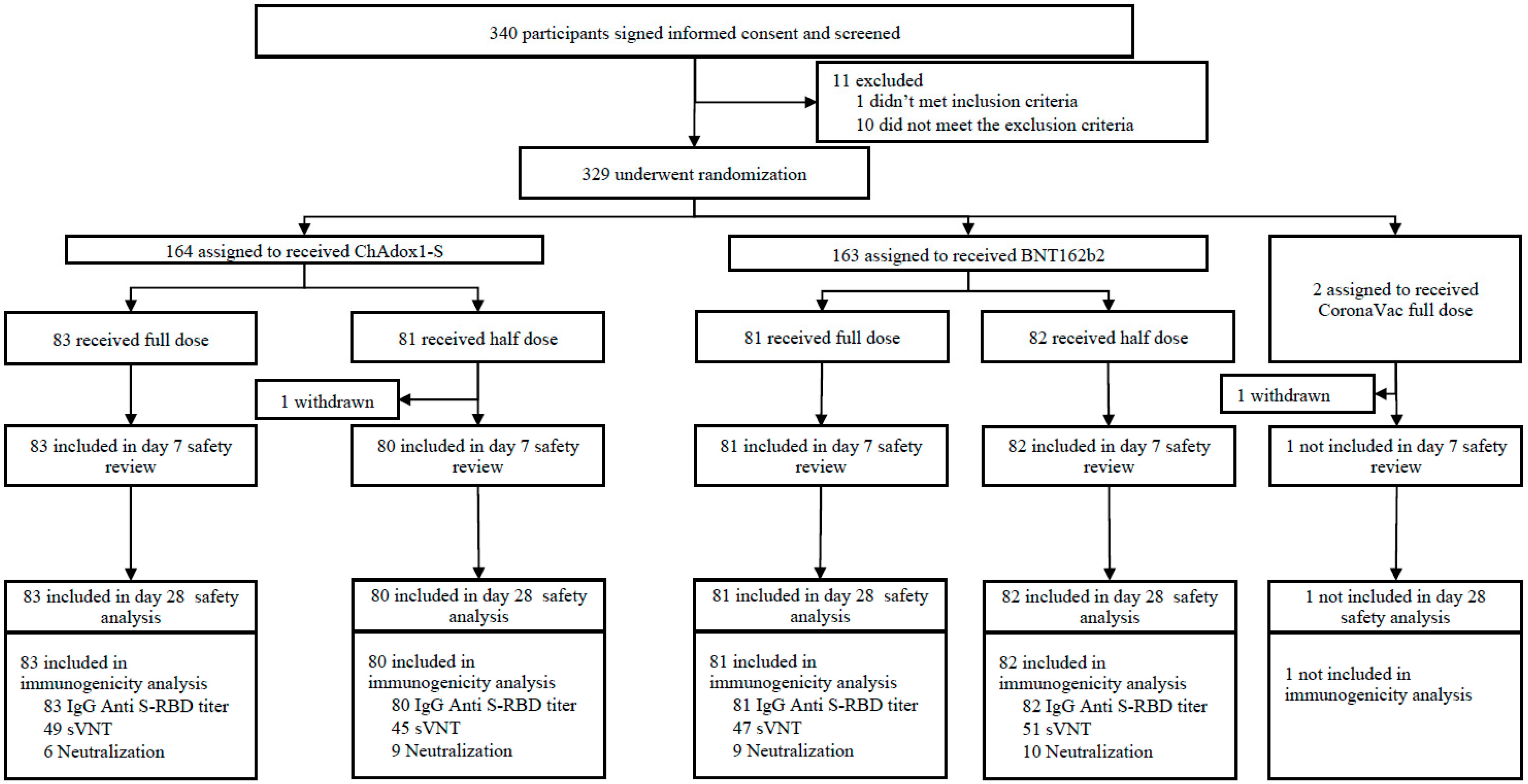 - Fadlyana, E.; Setiabudi, D.; Kartasasmita, C.B.; Putri, N.D.; Hadinegoro, S.R.; Mulholland, K.; Sofiatin, Y.; Suryadinata, H.; Hartantri, Y.; Sukandar, H.; et al. Immunogenicity and safety in healthy adults of full dose versus half doses of COVID-19 vaccine (ChAdOx1-S or BNT162b2) or full-dose CoronaVac administered as a booster dose after priming with CoronaVac: A randomised, observer-masked, controlled trial in Indonesia. Lancet Infect. Dis. 2023, 23, 545–555. [Google Scholar] [PubMed]
