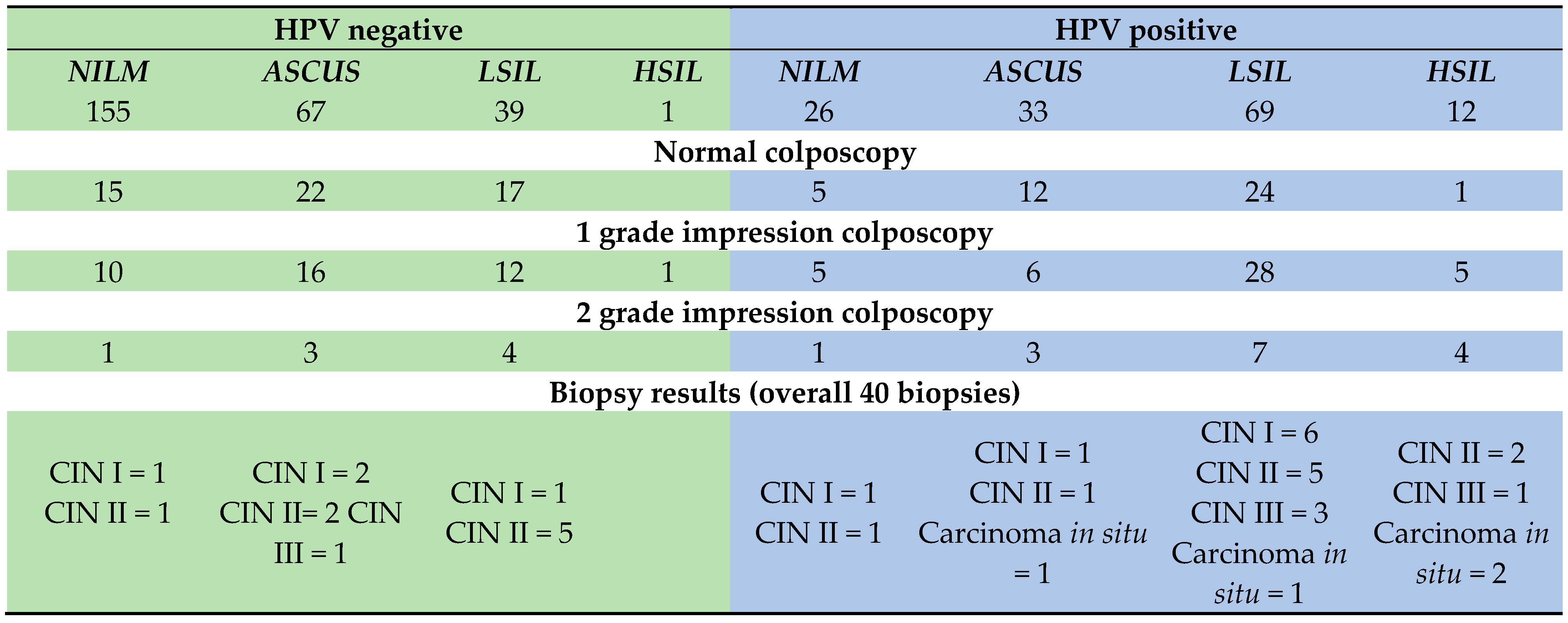 - Pleş, L.; Radosa, J.C.; Sima, R.M.; Chicea, R.; Olaru, O.G.; Poenaru, M.O. The Accuracy of Cytology, Colposcopy and Pathology in Evaluating Precancerous Cervical Lesions. Diagnostics 2022, 12, 1947. [Google Scholar] [CrossRef] [PubMed] [PubMed Central]
