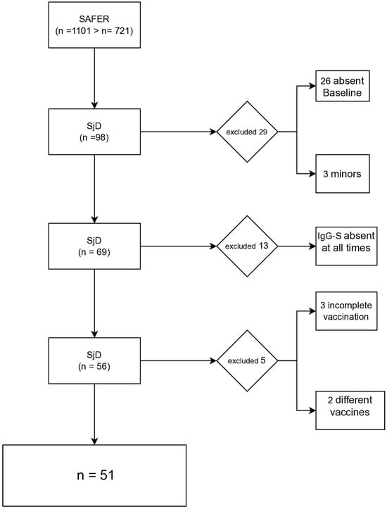 A total of 98 participants with SjD were found in the SAFER database via RedCap. Of these, 26 were excluded due to missing baseline data, and 3 were adolescents. Subsequently, 13 participants were excluded for lacking IgG-S results at all time points. Additionally, 3 participants with incomplete vaccination schedules and 2 with non-standard vaccine combinations (CoronaVac/ChAdOx1 nCoV-19 for T1/T2, BNT162b2/ChAdOx1 nCoV-19 for T3) were excluded. In total, 51 participants were included in the analysis (Figure 1).