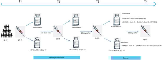 Data were collected from participants who received a primary vaccination regimen with CoronaVac or ChAdOx1 nCoV-19, and a booster dose with either ChAdOx1 nCoV-19 or BNT162b2. Participants were assessed at four time points: before the first dose (T1), before the second dose (T2), before the third dose (T3), and four weeks after the third dose (T4) (Figure 2).