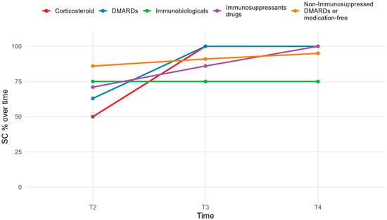 As shown in Figure 3, at T3, all medication categories had seroconversion rates above 80%, with 100% among those on conventional DMARDs or corticosteroids (p > 0.01). Only biologic users had rates below 80%, which remained consistent across time points.