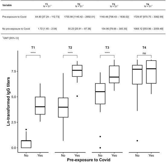 Comparison of geometric means of IgG anti-spike antibody titers against SARS-CoV-2 (IgG-S) between subgroups with (yes) and without prior exposure (no) to COVID-19, before the start of the study. **** p ≤ 0.0001; ns: not significant.