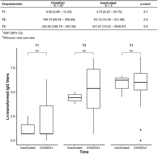 Figure 6 compares GMTs between primary vaccination with inactivated vaccine and ChAdOx1. In the ChAdOx1 group, GMTs increased significantly from T1 to T2 (p < 0.001), but not from T2 to T3 (p = 0.2). The small, inactivated vaccine subgroup limited between-group comparisons, with no significant differences at any time point (p > 0.05).