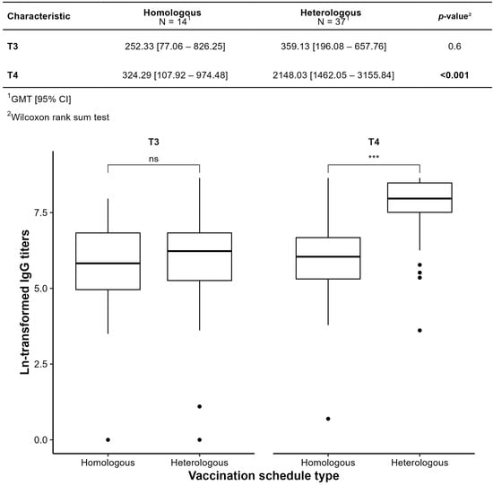 Comparison by type of vaccination schedule Homologous and Heterologous by geometric mean titer (GMT). *** p ≤ 0.001; ns: not significant.