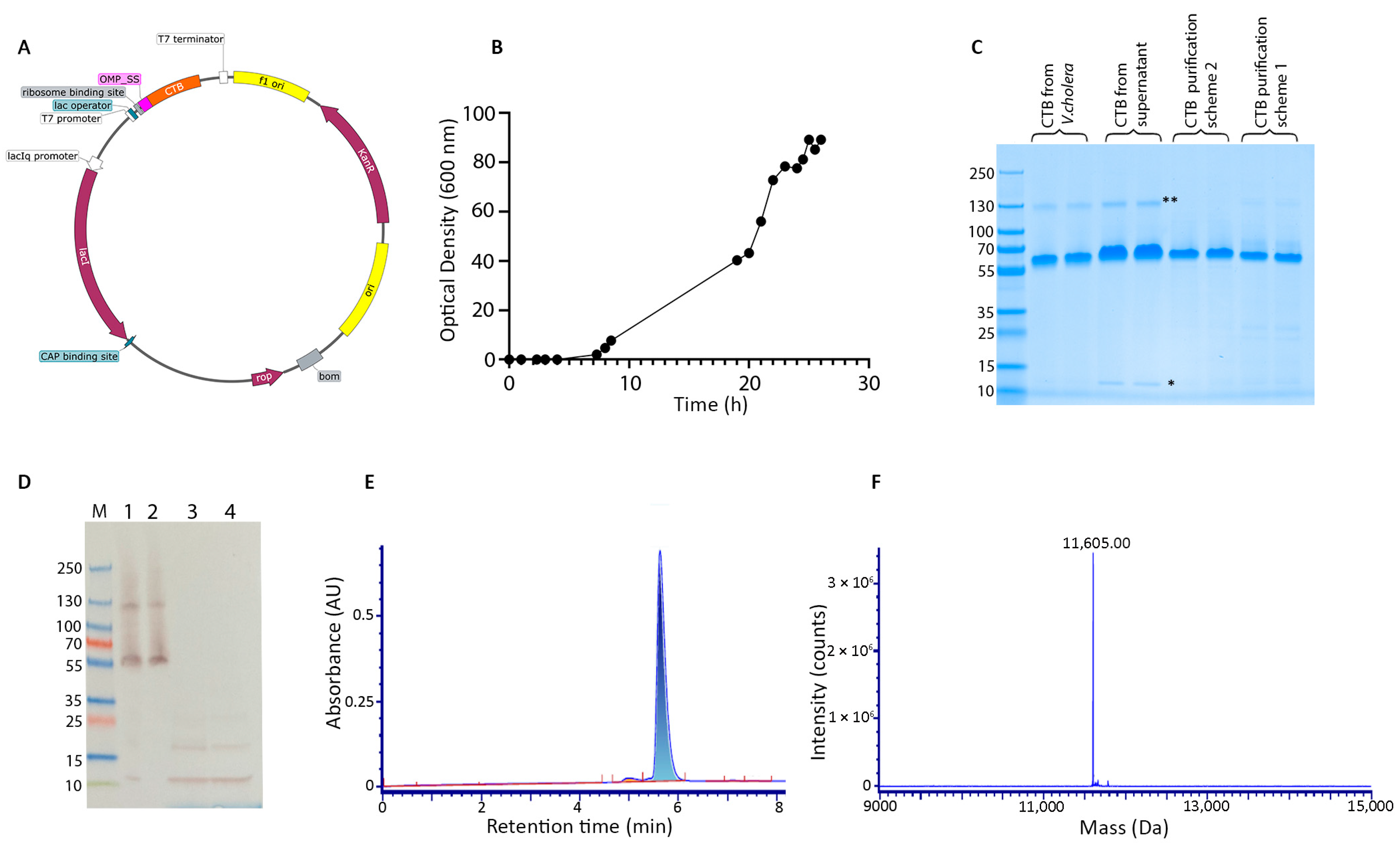 Figure 1. Expression, purification, and characterization of recombinant CTB. (A) Schematic representation of the expression plasmid encoding cholera toxin B subunit (CTB) under control of the T7 promoter, with an OmpA signal sequence for periplasmic export. (B) Growth curve of the recombinant E. coli strain showing optical density increase over time, indicative of successful cell growth. (C) Native SDS-PAGE analysis of CTB expression and purification. Lanes show CTB from V. cholerae (reference), CTB from recombinant culture supernatant, and CTB purified using two different chromatographic schemes (* and ** represent monomers and multimers, respectively). (D) Western blot analysis using anti-CTB antibodies confirming the identity of purified CTB in various fractions. Lane M: molecular weight marker; Lanes 1: non-denatured CTB from V. cholera, 2: native CTB from purification scheme 2, Lane 3: denatured CTB from V. cholera, Lane 4: denatured CTB from purification scheme 2. (E) Analytical HPLC SEC showing a single, symmetric peak corresponding to CTB. (F) Mass spectrometry analysis indicating a dominant peak at 11,605 Da, consistent with the expected monomeric mass of CTB.