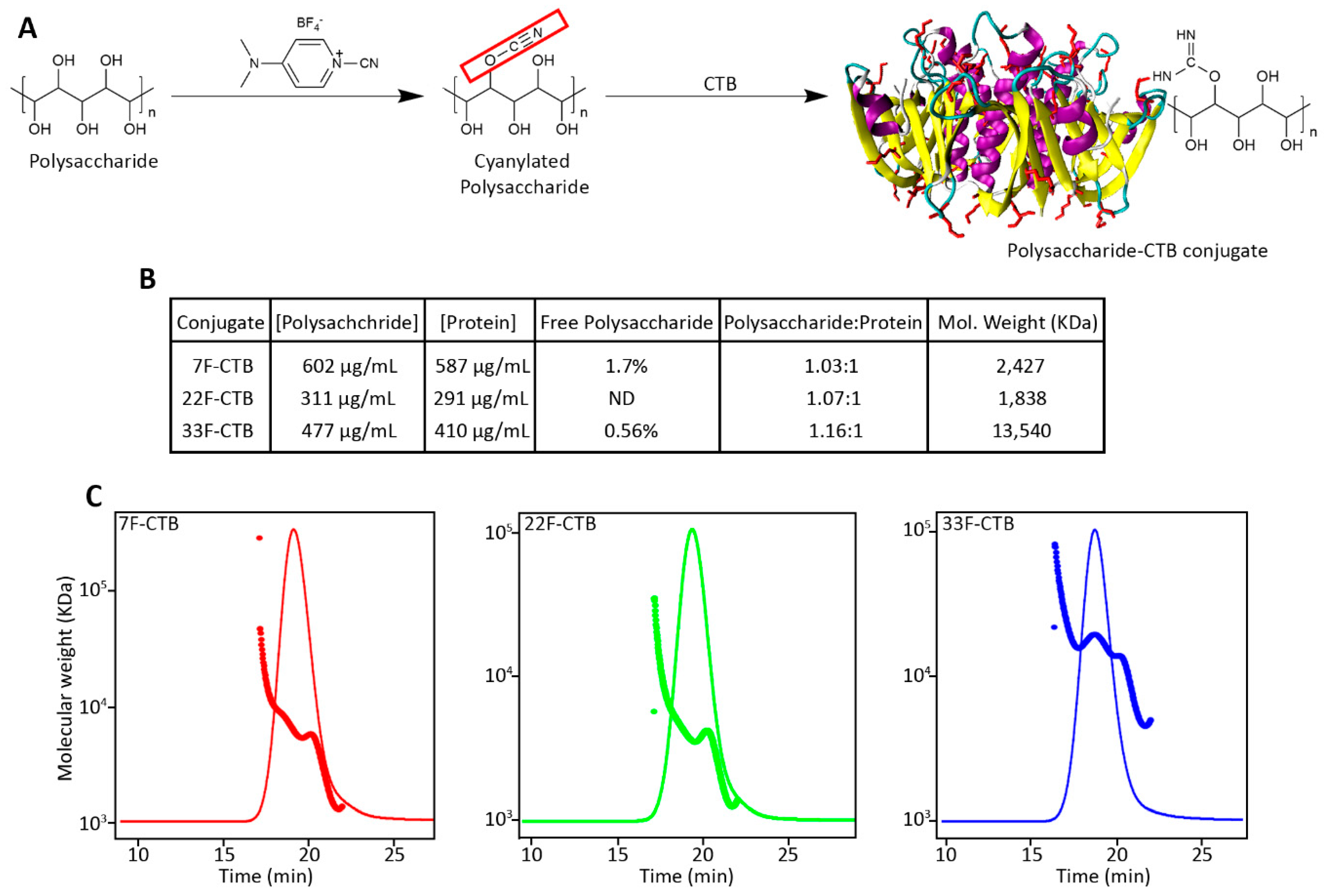 Figure 2. Characterization of polysaccharide-CTB conjugates synthesized. (A) Schematic representation of the conjugation strategy. Polysaccharides were first activated by cyanylation using 1-cyano-4-dimethylaminopyridinium tetrafluoroborate (CDAP), followed by covalent coupling to the cholera toxin B subunit (CTB) to generate polysaccharide–CTB conjugates. (B) Quantitative analysis of conjugate composition. Polysaccharide and protein concentrations were measured post-conjugation. Free (unconjugated) polysaccharide levels were determined by precipitating protein. Molecular weights were estimated using SEC-MALS. (C) Size exclusion chromatography–multi-angle light scattering (SEC-MALS) profiles of 7F-CTB (red), 22F-CTB (green), and 33F-CTB (blue) conjugates, showing elution time vs. molecular weight. Each profile indicates successful conjugation with distinct size distributions and molecular masses for each serotype.