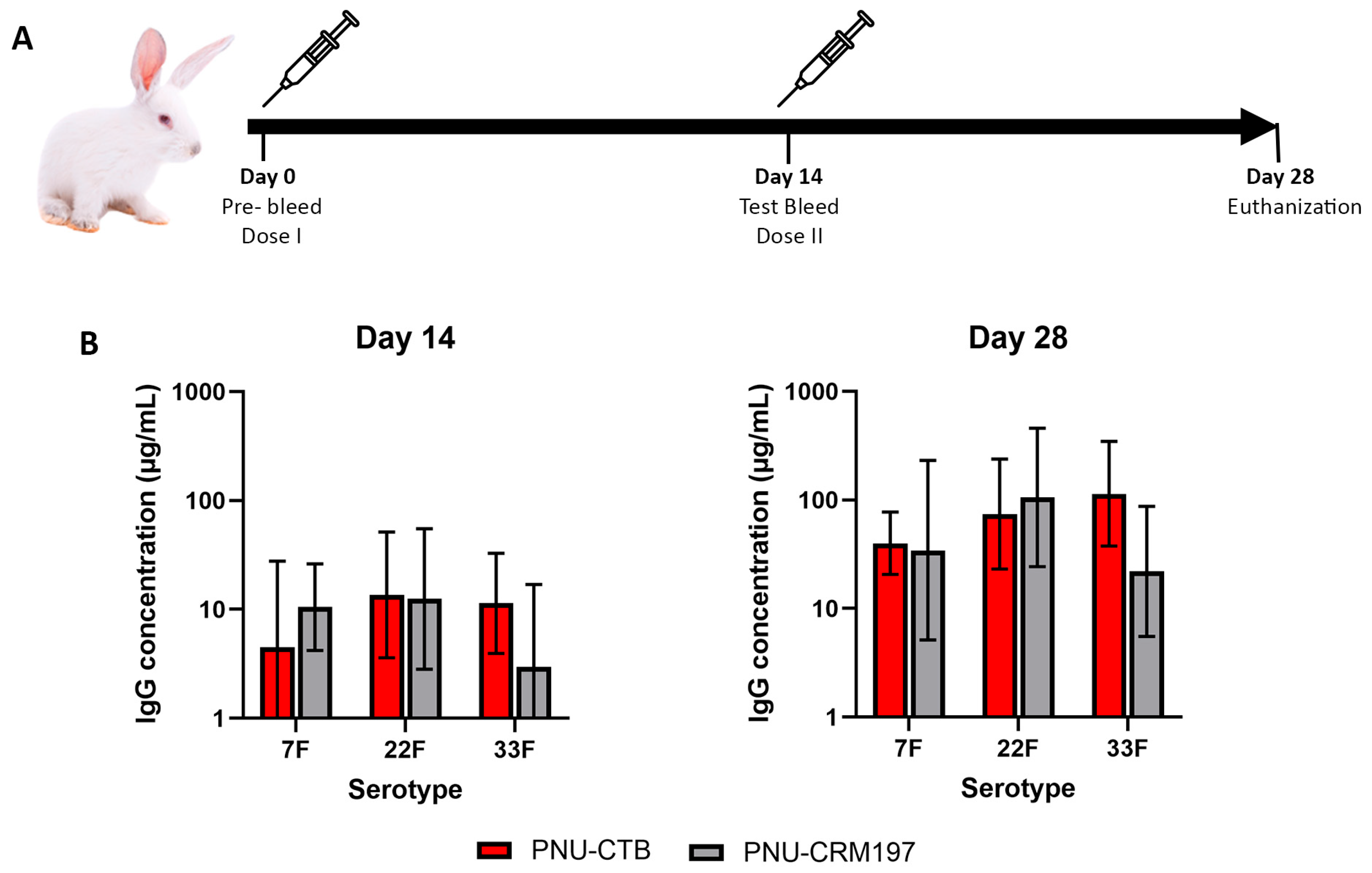 Figure 3. Immunogenicity of CTB and CRM197-conjugated pneumococcal vaccines in rabbits. (A) Schematic overview of the immunization protocol. Rabbits were immunized intramuscularly on Days 0 and 14 with alum-adjuvanted conjugate vaccines containing pneumococcal polysaccharides (7F, 22F, and 33F) coupled to either cholera toxin B subunit (CTB) or CRM197. (B) Serotype-specific IgG concentrations measured on Days 14 and 28 by multiplex bead-based immunoassay. Both CTB and CRM197-conjugated vaccines elicited measurable IgG responses following the prime and boost immunizations. Statistical comparisons were performed using unpaired two-tailed t-tests. A p-value of <0.05 was considered significant. No significant differences were observed between groups.