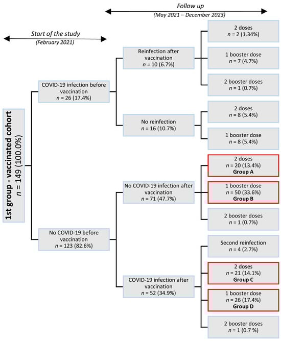 Flowchart of the distribution of participants into groups and subgroups by status of vaccination during COVID-19 infection. Note: The highlighted groups underwent more detailed analyses. Percentages were calculated based on the total sample size (n = 149).