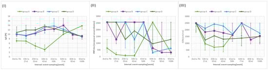 (I) Median and interquartile range (IQR) of anti-S IgG levels, (II) neutralizing antibody titers and (III) interferon-gamma release assay in individuals with different combinations of events—vaccination and postvaccination infection (group A—2 doses of vaccination, B—1 booster dose, C—2 doses of vaccination and infection, D—1 booster and infection). Note: Median values are connected by lines across weeks.