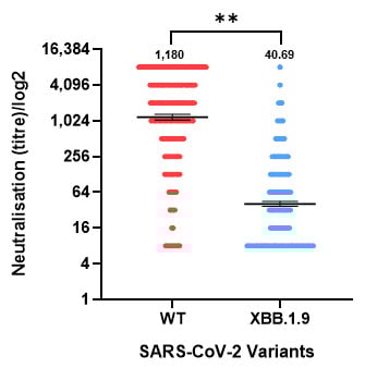 Neutralizing antibody titers against the SARS-CoV-2 wild-type (WT) and XBB.1.9 variants in the population in Israel. Serum samples were tested with neutralization against WT SARS-CoV-2 and XBB.1.9. Geometric mean titers (horizontal lines) with 95% confidence intervals (I bars) are presented, as well as the geometric mean titer value. Dots indicate individual serum samples. A significant reduction in immunity was observed against XBB.1.9. ** p ≤ 0.01.