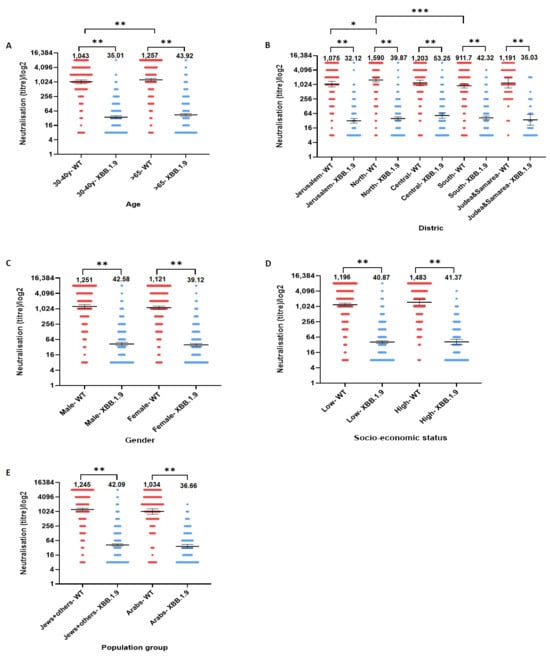 However, when comparing GMTs between WT and XBB.1.9 within each individual subgroup (e.g., within each age, gender, region, and socioeconomic group), a statistically significant reduction in neutralizing antibody titers was observed (p < 0.001 for all comparisons). This consistent intra-group reduction indicates that the Omicron sublineage XBB.1.9 elicited markedly lower neutralization responses relative to the WT variant across all population segments.
