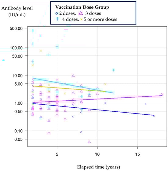 The relationship between the elapsed time (years) and antibody levels (IU/mL) by vaccine dose group is shown in Figure 1.