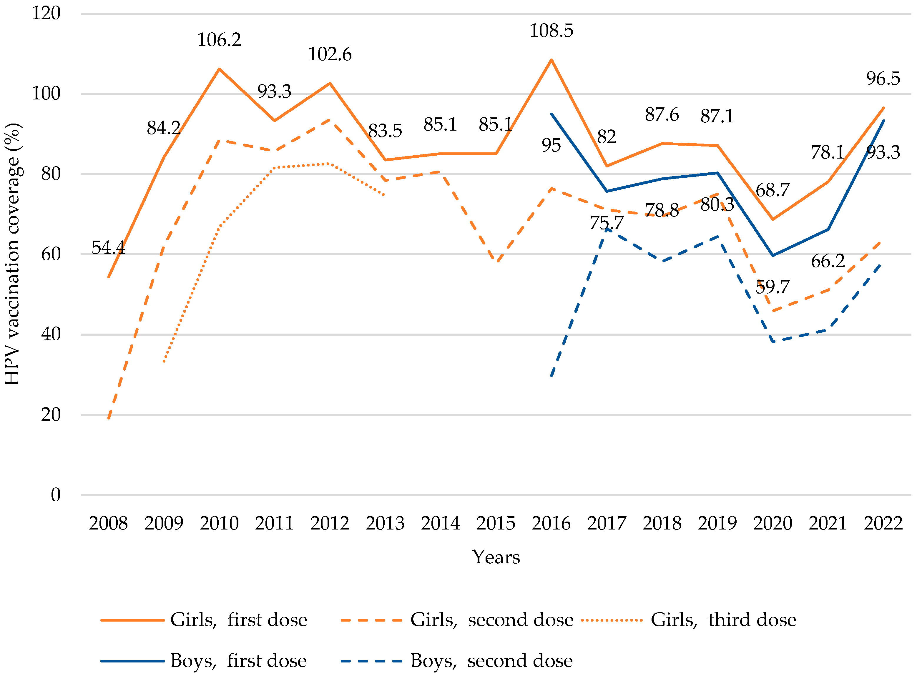 3.1. HPV Vaccine Uptake by Doses and Sex over Time